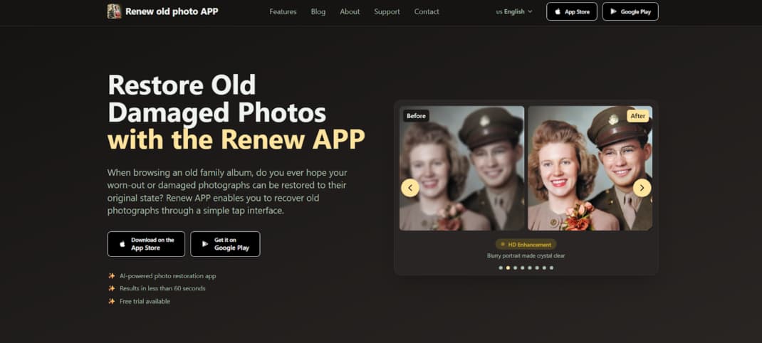 Renew Photo is a mobile app that restores old pictures on your smartphone. It uses specialized AI to handle the common problems: tears, fading, scratches, and lost color. You just tap a few times. The whole thing takes under a minute.